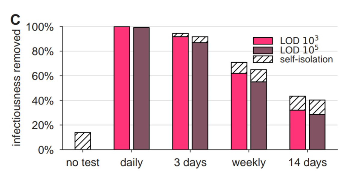 Reducing the sensitivity of SARS-CoV-2 tests to only 1% of today’s PCR tests is predicted to make very little difference to containing the disease. Yet testing every 3 days is dramatically more effective than even weekly testing! https://medrxiv.org/content/10.1101/2020.06.22.20136309v2